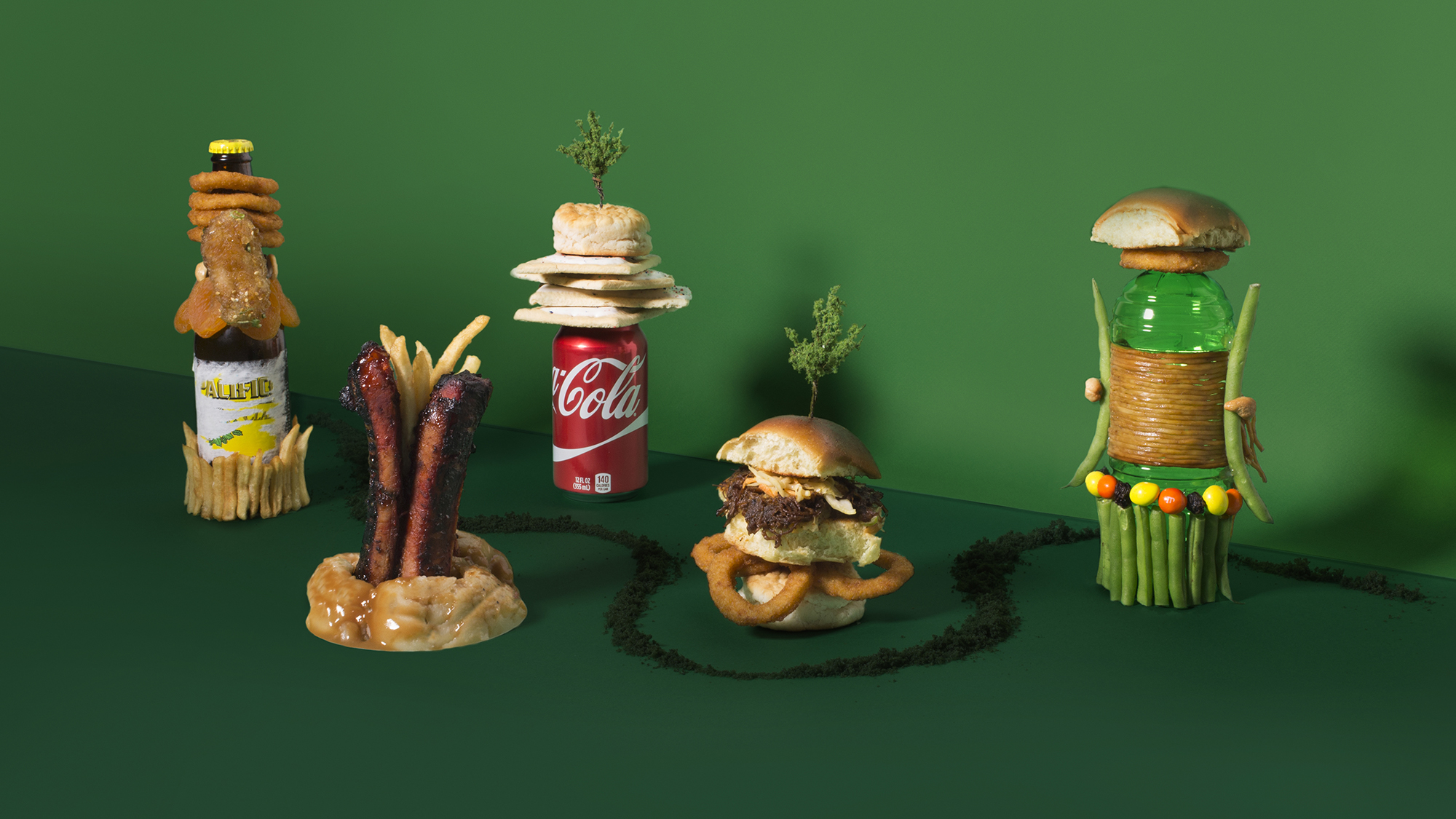Eater asked five writers to drive across the country and reflect on the food, surroundings and circumstances that brought them there. In turn, we created 5 photographic illustrations that serve as visual postcards, incorporating souvenirs (and of course, food) from each story.The brilliant essays by John Birdsall, Gustavo Arellano, Rachel Khong, Bijan Stephen and Rahawa Haile documenting their road trip and culinary journey can be found on Eater's website.